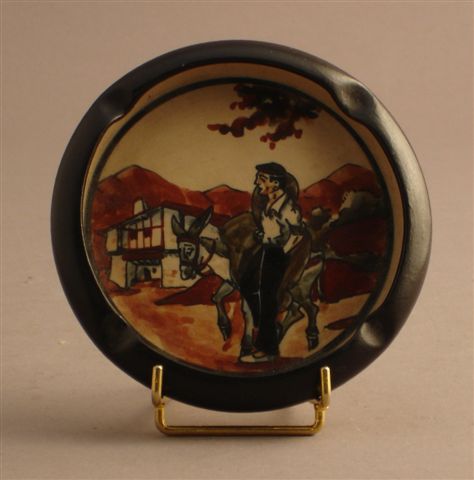 CENDRIER de forme ronde au décor de grand feu d'un paysan et de son âne devant une habitation. Marqué RF.