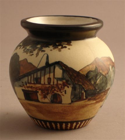 VASE bursiforme au décor de grand feu de deux paysans aux abords d'une habitation. Marqué RF, signé LE CORRONE.