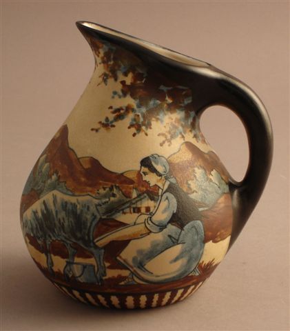 VERSEUSE piriforme à décor de grand feu d'une paysanne et d'une chèvre aux abords d'une habitation. Marquée RF, signée MOREAU.