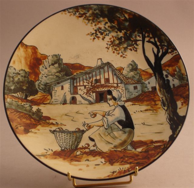 ASSIETTE au décor d'une paysanne ramassant des pommes aux abords d'une habitation. Marquée RF, signée LE CORRONE.