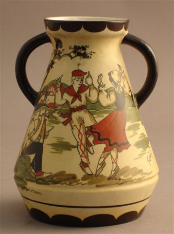 POT À LAIT en grès, de forme circulaire, à décor de grand feu, dans le goût néobasque, d'un couple dansant aux abords d'une habitation.
