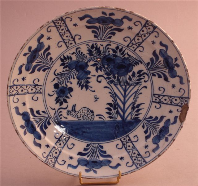 ASSIETTE en faïence. Dans le bassin, décor en bleu et blanc d'un chat sous un bouquet fleuri. Cartouches rayonnants décorés de fleurs.