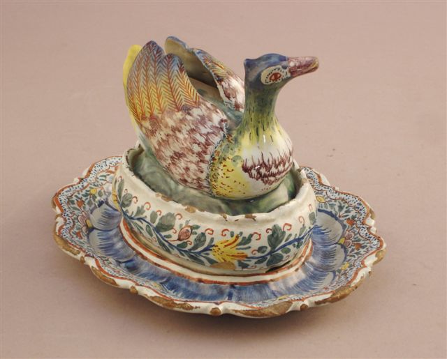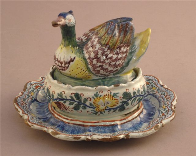BEURRIER couvert, à plateau adhérent, en faïence à décor floral polychrome. Le couvercle présentant une oie au plumage polychrome, traité en ronde-bosse. Marque. XVII-XVIIIème.