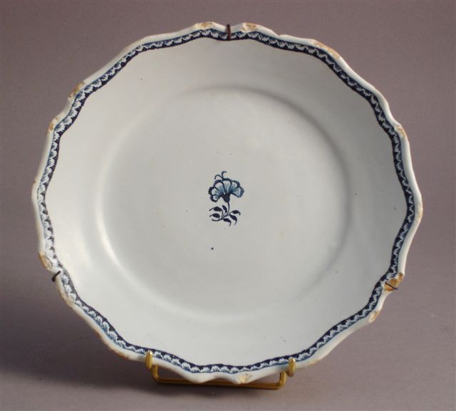 ASSIETTE à bord chantourné orné d'une frise bleu de cobalt, le bassin contient en son centre un oeillet bleu de cobalt.