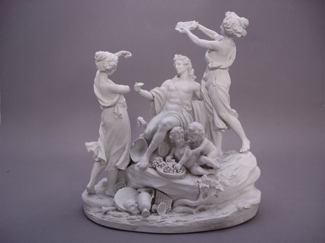 BISCUIT représentant Apollon servi par les nymphes, une le couronnant, l'autre lui servant à boire. A ses pieds, deux puttis jouant auprès d'un panier de grappes de raisin, surmontent un trophée de musique. Derrière Apollon, un autre putto joue avec son chien.