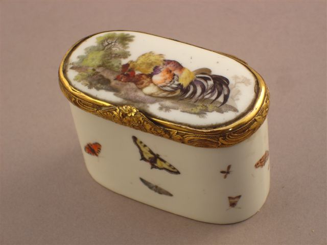 BOÎTE de forme ovale en porcelaine et monture doré ciselée de fleurs et d'agrafes. Décor au petit feu d'un couple de gallinacés sur le couvercle, de papillons et d'insectes indigènes sur la boite.