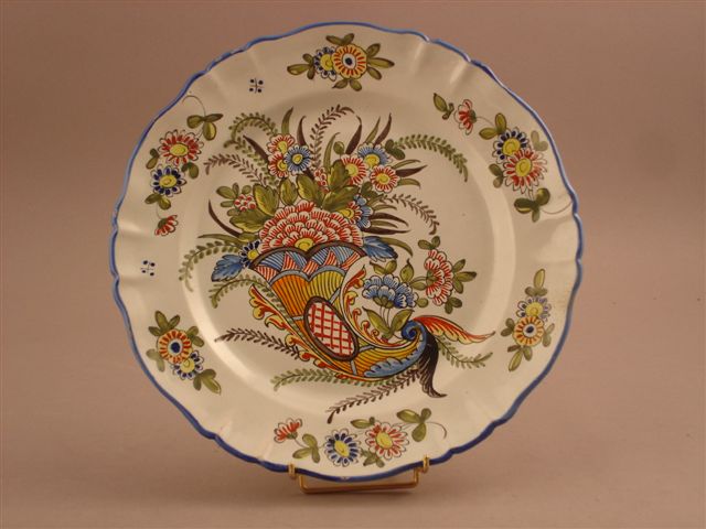 PLAT en faïence polychrome. Décor à la corne dans le goût de Rouen.