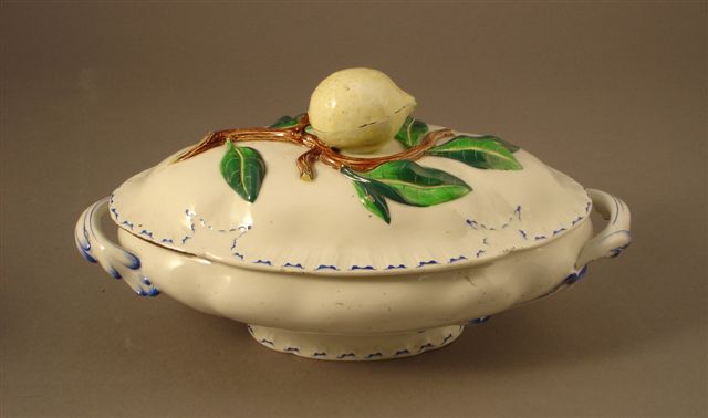 CREIL et MONTEREAU. SOUPIÈRE en céramique de forme chantournée. Prises feuillagées rehaussées de bleu. Couvercle chantourné, contour rehaussé de bleu, orné en ronde-bosse d'un citron branché polychrome.