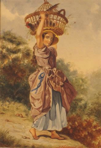 Jeune paysanne aux pieds nus portant une poule dans un panier d'osier. Aquarelle gouachée. Signée en bas à droite et datée 1852.