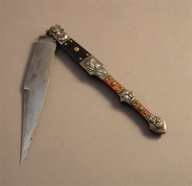 COUTEAU de chasse. Manche en acier sculpté de profils féminins agrémenté de plaques en corne cloutées teintées noires et rouges. Lame en acier signée Haudeville en Albacette.