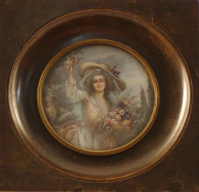 Jeune femme constituant un bouquet de fleurs. Miniature sur ivoire signée en bas à droite.