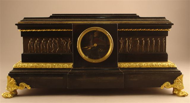 PENDULE de forme rectangulaire en marbre noir, bronze patiné et doré. Frise centrale de bronze patiné présentant des personnages à l'antique centrée d'un carré de marbre noir contenant le cadrant à chiffres romains. Corniche moulurée de marbre noir avec ressaut central. L'ensemble repose sur une plinthe de marbre noir ornée d'une frise de feuilles de laurier de bronze doré, dont le ressaut central souligne le cadran. Pieds griffus de bronze doré.
