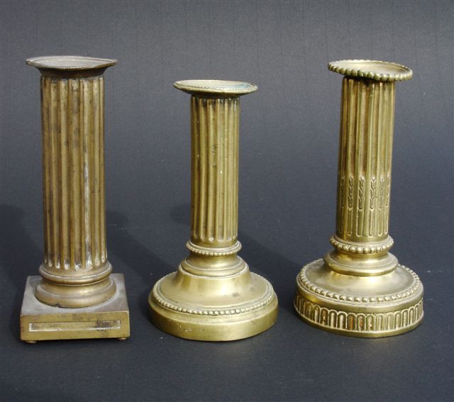 Trois FLAMBEAUX en bronze. Pieds quadrangulaires pour deux et circulaires pour un. Fût en colonnes cannelées. Décor de rangs de perles.
