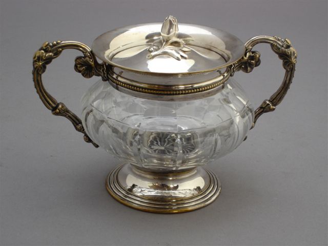 SUCRIER en bronze argenté et cristal à deux anses feuillagées. Le col décoré d'un rang de perles, la base à moulures concentriques. Le couvercle est orné d'un frételle en fruit éclaté.