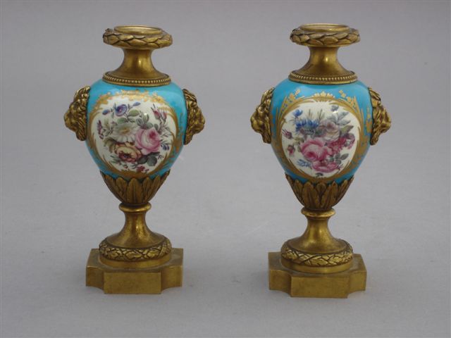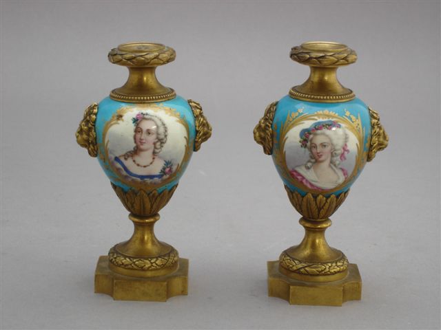 Paire de petits VASES en porcelaine à décor de médaillons en réserve : bustes d'élégantes et bouquets fleuris, sur fond bleu azur. Monture en bronze ciselé et doré de protomés, tores de laurier, rang de perles, feuilles d'acanthe, sur une base en forme de croix.