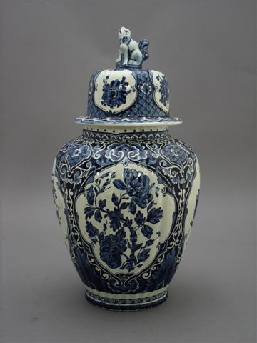 POTICHE couverte en faïence de Delft, à panse godronnée et décor en bleu et blanc : bouquets fleuris dans des réserves. Le couvercle est surmonté d'un lion.