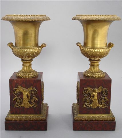 Paire d'URNES en bronze ciselé et doré en forme de vases Médicis sur une base cubique en marbre rouge. Les vases décorés de rangs de perles, feuilles d'eau, tores de lauriers. La base est ornée de motifs en bronze doré tels que personnages mythologiques ailés dont les jambes se terminent en entrelacs de feuilles d'acanthe, tores de lauriers à rubans.