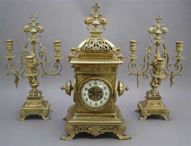 GARNITURE de CHEMINÉE en bronze doré et ciselé comprenant : une PENDULE borne à cadran émaillé et riche décor de chimères, entrelacs, amortissement en urne et dessus de pendule en forme de toiture aux tuiles simulées. Elle repose sur quatre pieds à enroulement.
