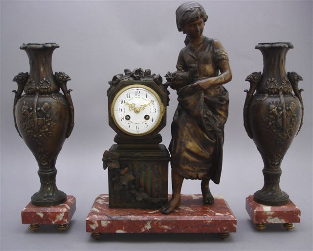 GARNITURE de CHEMINÉE en régule comprenant : une PENDULE à la fillette portant dans sa jupe un nid et des fleurs. Elle est adossée à un pilastre cannelé surmonté du cadran émaillé dans un encadrement octogonal. La pendule repose sur une base en marbre campan et quatre pieds miches.
