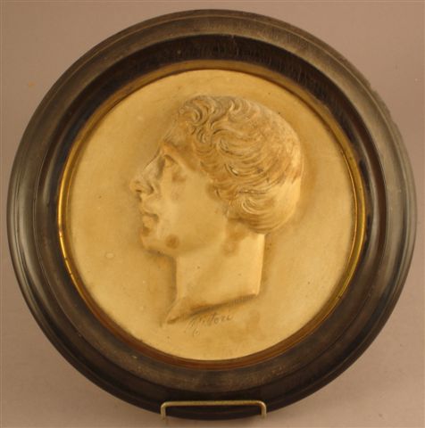 MÉDAILLON en plâtre figurant un homme de profil. Signé dans la pâte Ristori. Cadre de bois noirci.