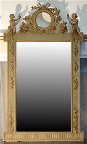 MIROIR de forme rectangulaire en bois mouluré et sculpté. Base cannelée, d'où s'élèvent deux rosiers ornant la base des montants. Leur partie supérieure est ornée de chutes de bouquets enrubannés. Sommé d'un oculus enrubané, flanqué de branches de gui et de cornes d'abondance, entouré de deux putti traités en ronde-bosse.
