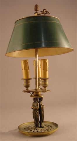 LAMPE BOUILLOTTE en bronze à trois lumières. Bobèches réunies par une tablette triangulaire soutenue par trois cariatides faisant le fût. Socle circulaire ajouré.