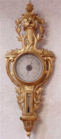 THERMOMÈTRE-BAROMÈTRE en bois mouluré sculpté et doré, en forme de balancier. Le cadran est signé Delahaye, opticien, Passage Verdeau 17, Paris.