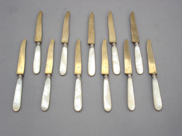 Lot de 11 COUTEAUX, manche en nacre, lames en métal doré.