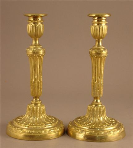 Paire FLAMBEAUX en bronze doré et ciselé. Binets godronnés terminés en piédouches ornés d'une frise de perles s'appuyant sur des fût cintrés cannelés et rudentés reposant sur des socles circulaires ornés de palmettes rudentées, de frises de perles et de filets enroulés de feuilles d'acanthe.