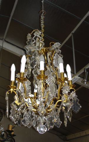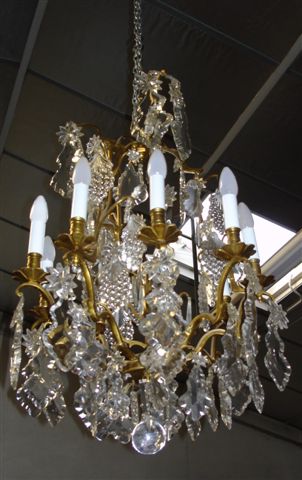 Paire de LUSTRES en bronze ciselé et doré à neuf lumières. Ornementation de pendeloques, gouttes et grappes de raisin en cristal.