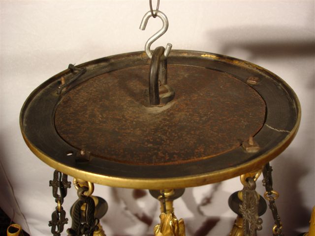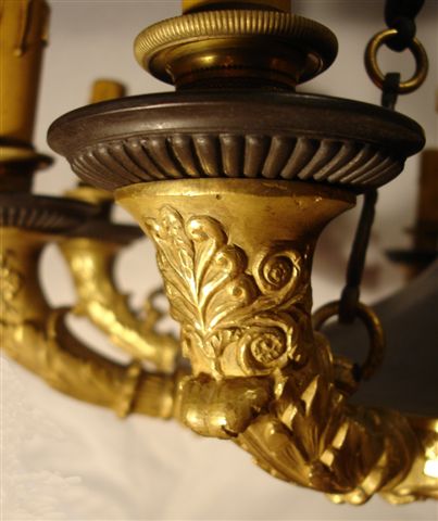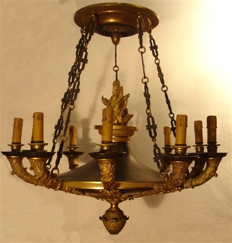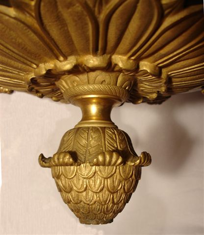 LUSTRE en bronze doré et patiné à 8 bras de lumières. Vasque surmontée d'une cassolette, retenue par des chaines. Riche ornementation de palmettes stylisées, acanthes, pomme de pin, godrons, feuilles d'eau.