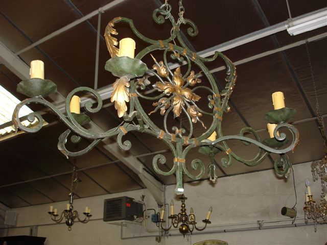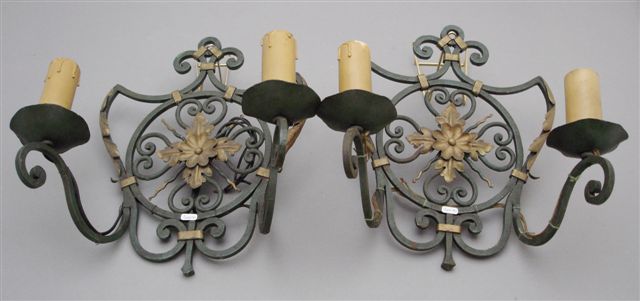 LUSTRE à six lumières en fer forgé et une paire d'appliques à deux lumières. Ajouré d'une rosace, d'enroulements et de rinceaux ornés de feuilles d'acanthe.