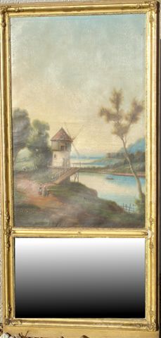 GLACE ET SON TRUMEAU, en bois doré. La toile figure un moulin au bord d'un lac.