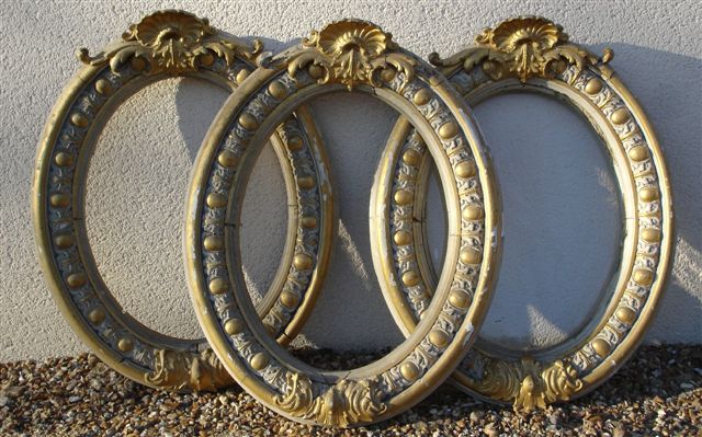 Ensemble de trois ENTOURAGES D'OEIL DE BOEUF en bois mouluré, sculpté, peint et doré. Bases ornées d'un médaillon. Cadres sculptés d'une frise d'oves agrémentée de feuilles d'acanthe. Sommés d'entrelacs entourant une feuille d'acanthe surmontée d'une coquille.