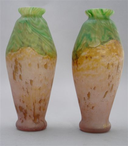 SCHNEIDER. Paire de VASES en verre, de forme navette. Verre double couches à volutes marbrées intercalaires, tombant depuis le col. Le fond est rose orné de coulées vertes et oranges. Pièces du tout début de la production.