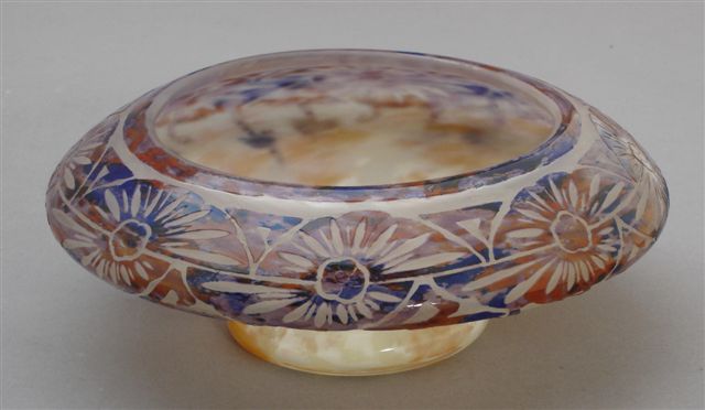 CHARDER et LE VERRE FRANCAIS. COUPE lenticulaire en verre à décor d'ancolies dégagées à l'acide et entièrement reprises à la roue. Il s'agit d'un des décors les plus élaborés de la gamme. Signature CHARDER en réserve et le Verre Français gravé sur le pied.