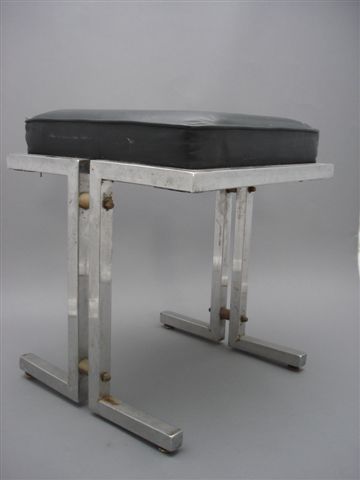 Paire de TABOURETS en cuir noir et piètements en métal chromés. Assises carrées en cuir. L'encadrement de l'assise s'ouvre sur deux côtés pour se prolonger en piètement constitué de deux tiges métalliques chromées accolées se terminant toutes les deux par un sabot répétant la largeur de l'assise.