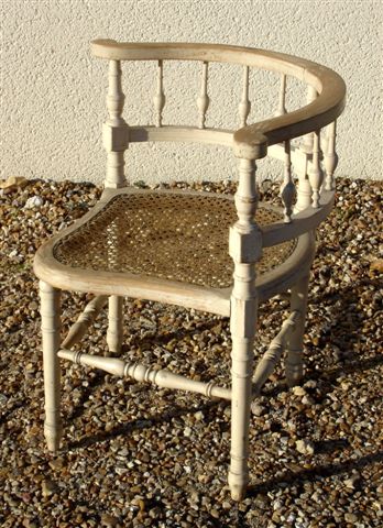 SIÈGE DE BUREAU, en bois mouluré, tourné, relaqué blanc. Dossier ajouré à balustres, montants, entretoises tournées. Assise cannée.