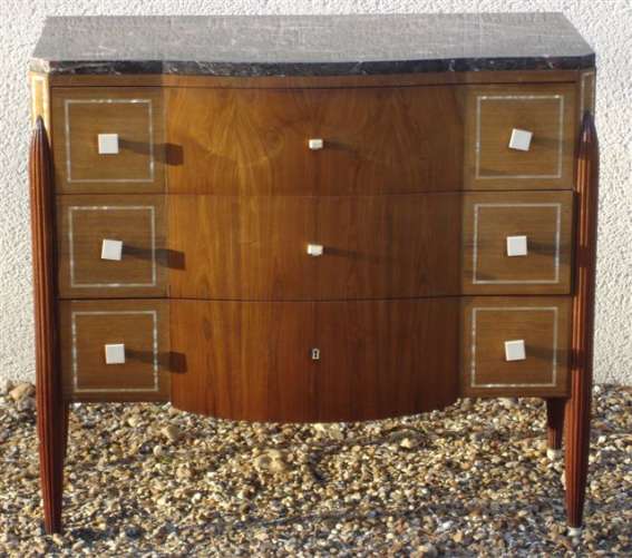 COMMODE de forme rectangulaire en bois de placage. Elle ouvre à trois tiroirs sur trois rangs sans traverse. Les 4 montants sont ornés de fûts engagés, fuselés et cannelés ; ceux antérieurs sont à pans coupés. Prises quadrangulaires à pans en ivoire. Ornements de nacre d'encadrements sur les flancs, les montants et les tiroirs. Dessus de marbre gris.