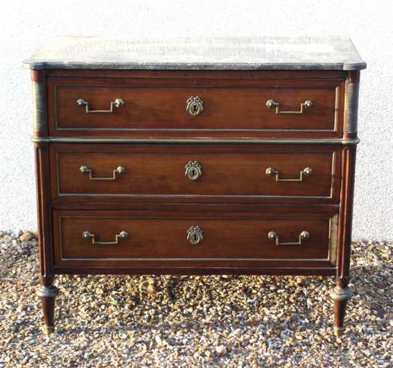 COMMODE de forme rectangulaire en acajou et placage d'acajou. Elle ouvre à trois tiroirs séparés de deux traverses. Les montants en colonnes engagées cannelées se terminent en pieds toupies. Ornements de bronzes dorés tels que : entrées de serrure, poignées, baguettes, encadrements, bagues au piétement.