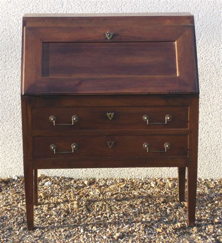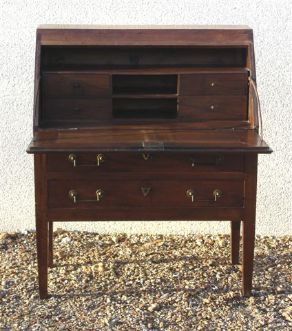 SECRÉTAIRE À ABATTANT en bois naturel. Il ouvre à deux tiroirs et un abattant découvrant quatre tiroirs, dont un secret, et un casier. Pieds gaine.
