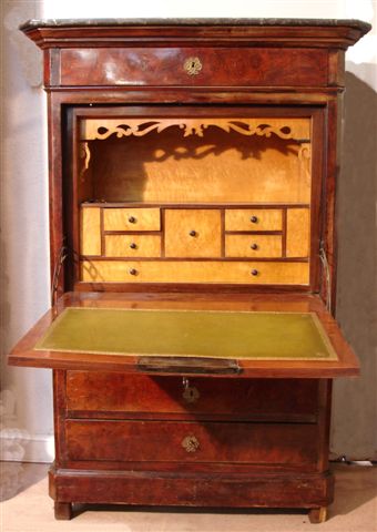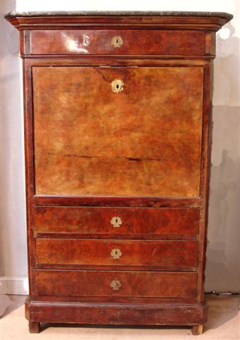 SECRÉTAIRE VERTICAL À ABATTANT de forme rectangulaire en placage d'acajou. Il ouvre à quatre tiroirs et un abattant découvrant six tiroirs. L'intérieur est plaqué de loupe d'orme.