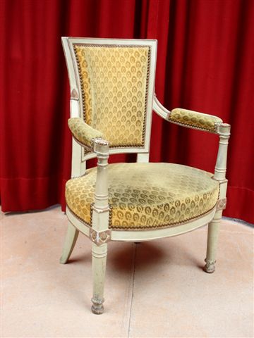 FAUTEUIL cabriolet en bois laqué blanc mouluré et sculpté. Les accotoirs reliés au dossier par un motif de feuille lancéolé, reposent sur des supports en colonne. La ceinture galbée est interrompue par les dés de raccordement sculptés de fleurettes. Pieds antérieurs en colonne fuselée, pieds postérieurs sabre.