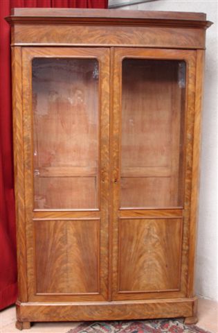 BIBLIOTHÈQUE de forme rectangulaire en acajou mouluré et placage d'acajou. Elle ouvre par deux vantaux vitrés. Montants à pans coupés. Pieds moulurés.
