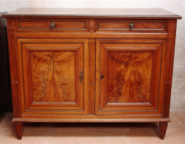 BUFFET bas rustique en noyer et bois de placage. Il ouvre en façade à deux tiroirs et deux vantaux. Les montants droits sont cannelés et rudentés, ils se terminent par des pieds en gaines. Le plateau marqueté, est ceint d'une corniche en laiton. Les tiroirs et les vantaux encadrés par des baguettes de laiton.