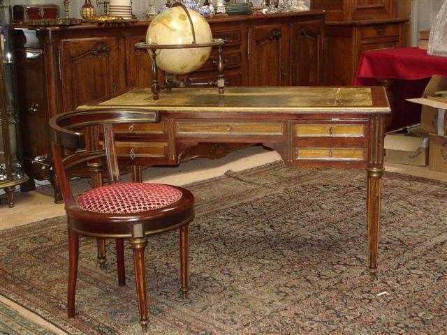 BUREAU de forme rectangulaire en acajou et placage d'acajou. Il ouvre à quatre tiroirs. Plateau gainé de cuir. La partie centrale ménage un renfoncement. Les montants cannelés. Chaque côté possède une tablette dissimulée. Pieds fuselés cannelés terminés en toupies de bronze doré. Ornements de bronzes dorés tels que : entrées de serrures, encadrements, garnitures de cannelures, bagues au piétement.