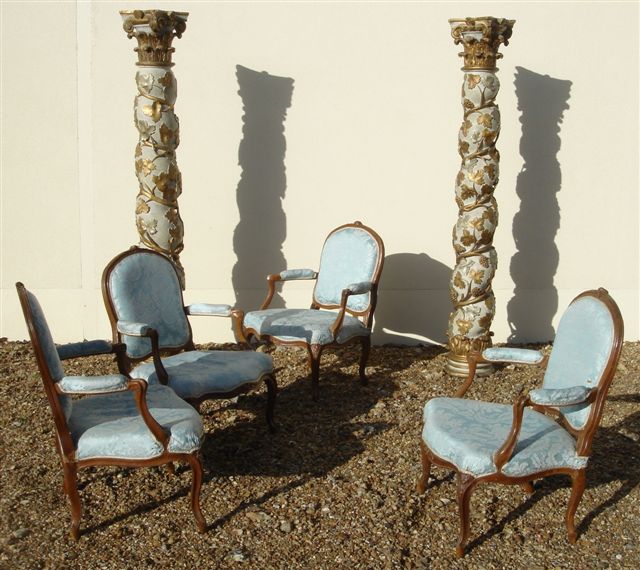 Suite de quatre FAUTEUILS à la reine, à dossier plat violoné, en hêtre mouluré. Décor sculpté de fleurs en haut du dossier, sur la traverse inférieure et les pieds antérieurs. Les supports d'accotoir en retrait et les pieds sont galbés et nervurés. (Bouts de pieds refaits).