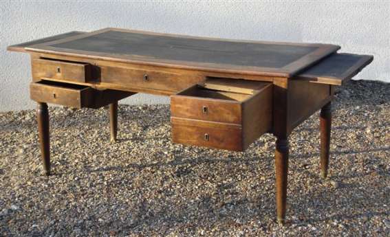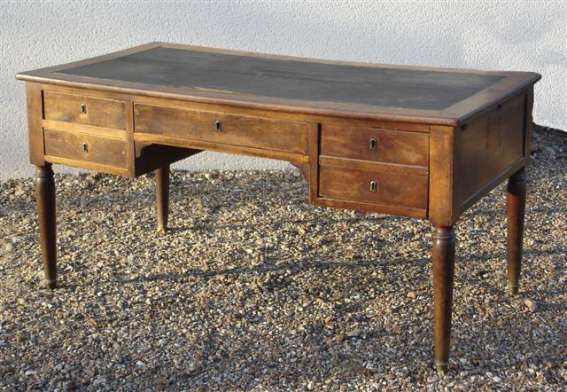 BUREAU de forme rectangulaire en noyer. Plateau garni de cuir. Quatre tiroirs en façade, dont un, plus grand, imite un double tiroir et contient un casier fermé par une serrure. Ornements de bronzes tel que : entrées de serrures, sabots.