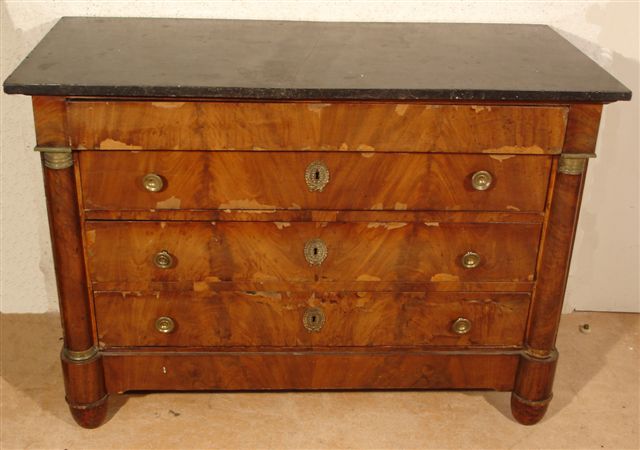 COMMODE rectangulaire en placage d'acajou à trois rangs de tiroirs. Les montants en colonnes engagées supportent un entablement dissimulant un tiroir. Elle ouvre à trois tiroirs sur trois rangs. Les socles des colonnes engagées font piètement antérieur. Ornements de bronzes dorés tels que entrées de serrures et bagues des colonnes. Dessus de marbre noir.