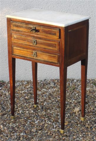 CHEVET rectangulaire en bois de placage à trois tiroirs et dessus de marbre blanc. Travail ancien.